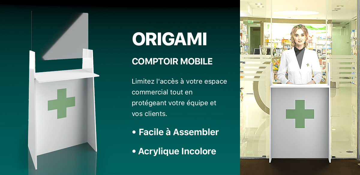 Comptoir de protection pour les pharmacies et les commerces, qui travaillent avec le magasin fermé, le service devant être effectué en dehors de l’espace.