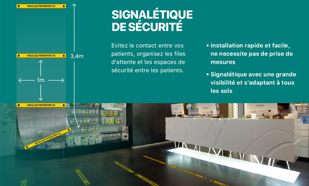 La signalétique pour sols est facile à appliquer, s’adapte à tous les surfaces (fort contraste) et détermine la distance obligatoire entre les clients qui attendent d’être pris en charge.