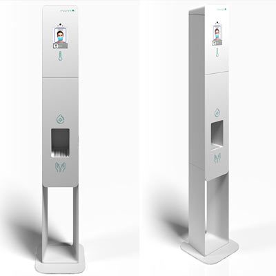 Terminal de reconhecimento facial com tecnologia de visão computacional. Possui um dispensador de álcool gel automático, sistema de medição de temperatura corporal, registo de informação e verificar o uso de máscaras.