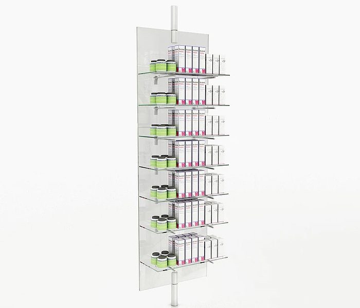 Linear em vidro e MDF com calhas verticais, regulação em altura. Suportes em alumínio com acabamento de borracha. O Rev tem fixação ao teto e ao chão. Capacidade de rotação em 360 graus.